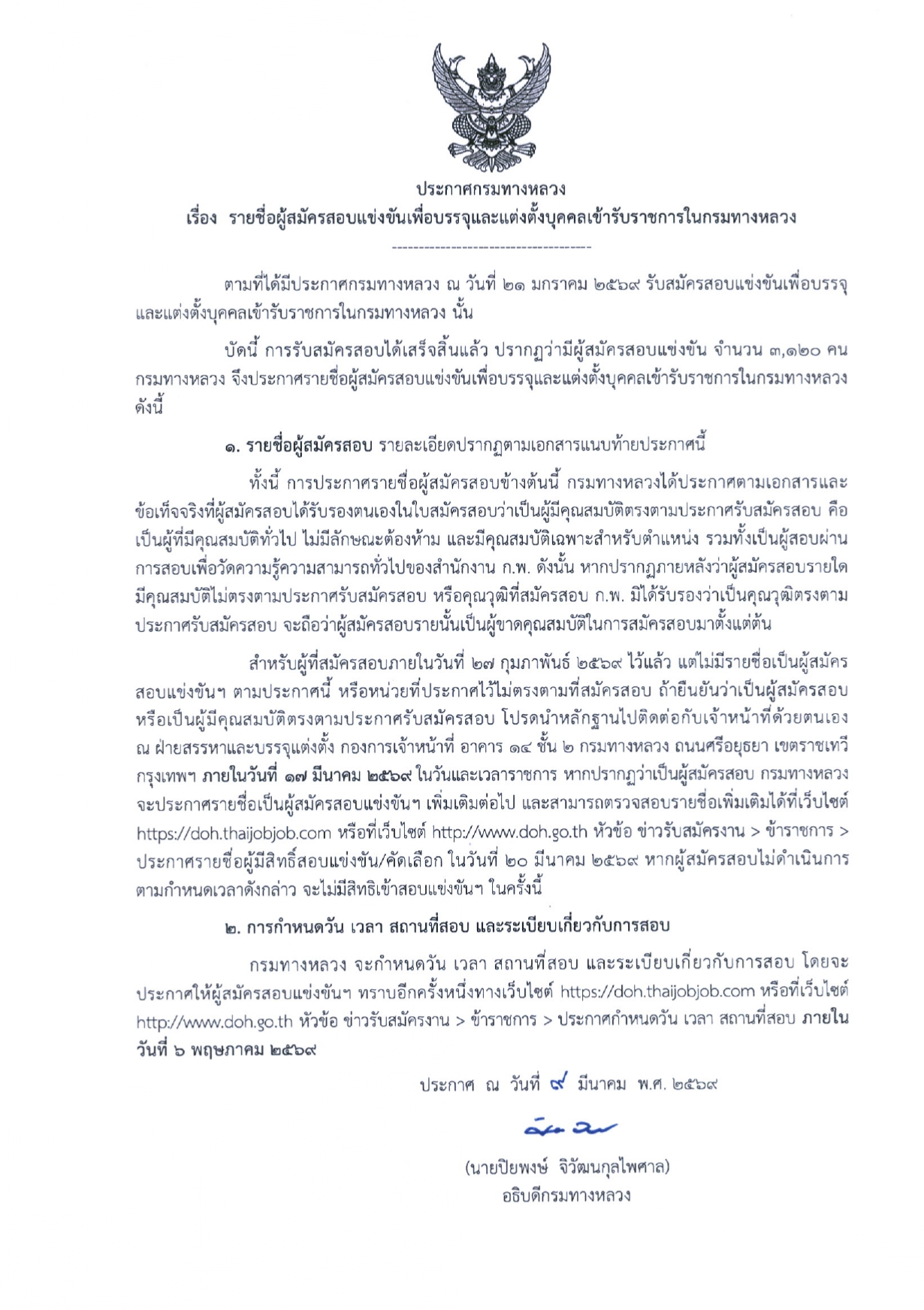 ประกาศกรมทางหลวง เรื่อง รายชื่อผู้สมัครสอบแข่งขันเพื่อบรรจุและแต่งตั้งบุคคลเข้ารับราชการในกรมทางหลวง ตามที่ได้มีประกาศกรมทางหลวง ณ วันที่ ๒๑ มกราคม ๒๕๖๙ รับสมัครสอบแข่งขันเพื่อบรรจุ และแต่งตั้งบุคคลเข้ารับราชการในกรมทางหลวง
