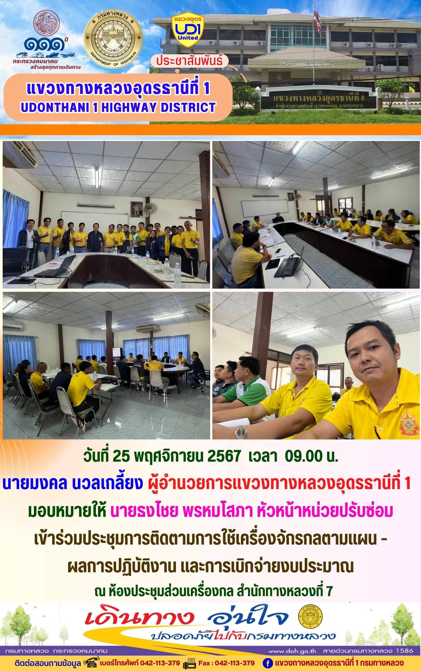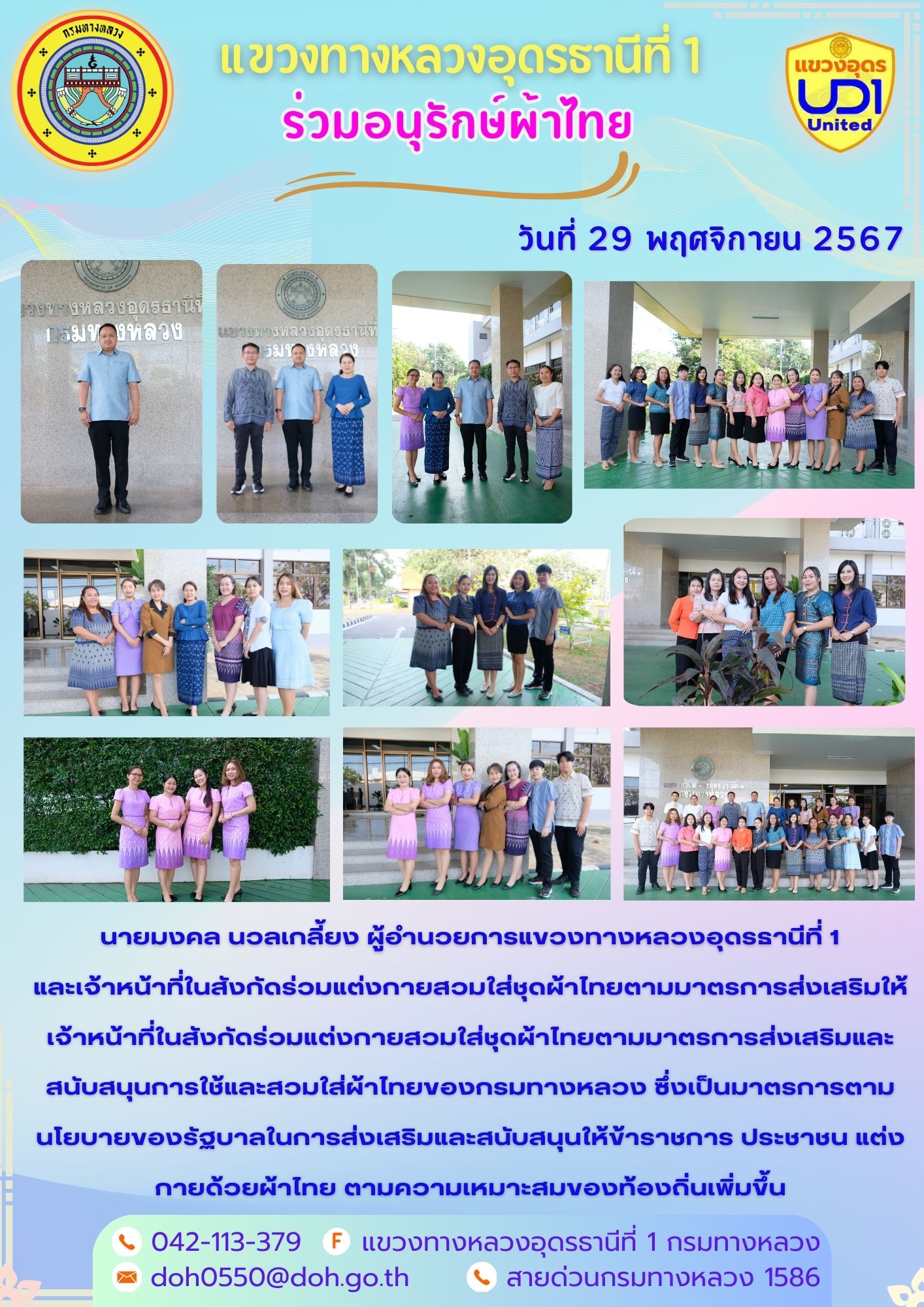 นายมงคล นวลเกลี้ยง ผู้อำนวยการแขวงทางหลวงอุดรธานีที่ 1 และเจ้าหน้าที่ในสังกัดร่วมแต่งกายสวมใส่ชุดผ้าไทยตามมาตรการส่งเสริมให้เจ้าหน้าที่ในสังกัดร่วมแต่งกายสวมใส่ชุดผ้าไทยตามมาตรการส่งเสริมและสนับสนุนการใช้และสวมใส่ผ้าไทยของกรมทางหลวง ซึ่งเป็นมาตรการตามนโยบายของรัฐบาลในการส่งเสริมและสนับสนุนให้ข้าราชการ ประชาชน แต่งกายด้วยผ้าไทย ตามความเหมาะสมของท้องถิ่นเพิ่มขึ้น