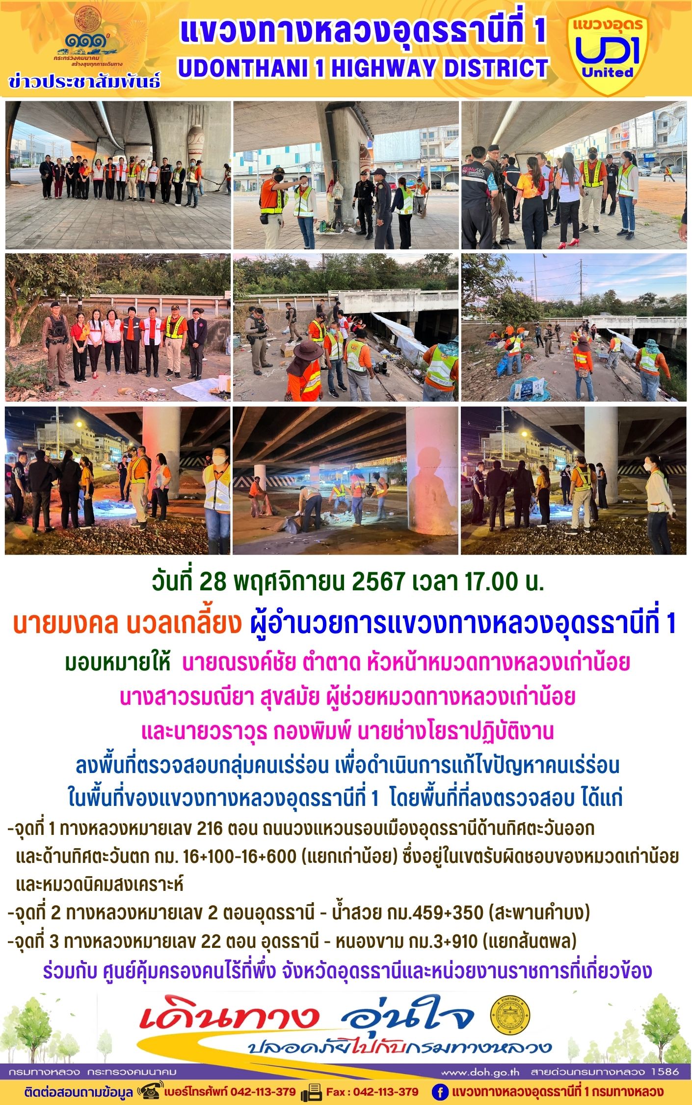 ลงพื้นที่ตรวจสอบกลุ่มคนเร่ร่อน เพื่อดำเนินการแก้ไขปัญหาคนเร่ร่อน ในพื้นที่ของแขวงทางหลวงอุดรธานีที่ 1