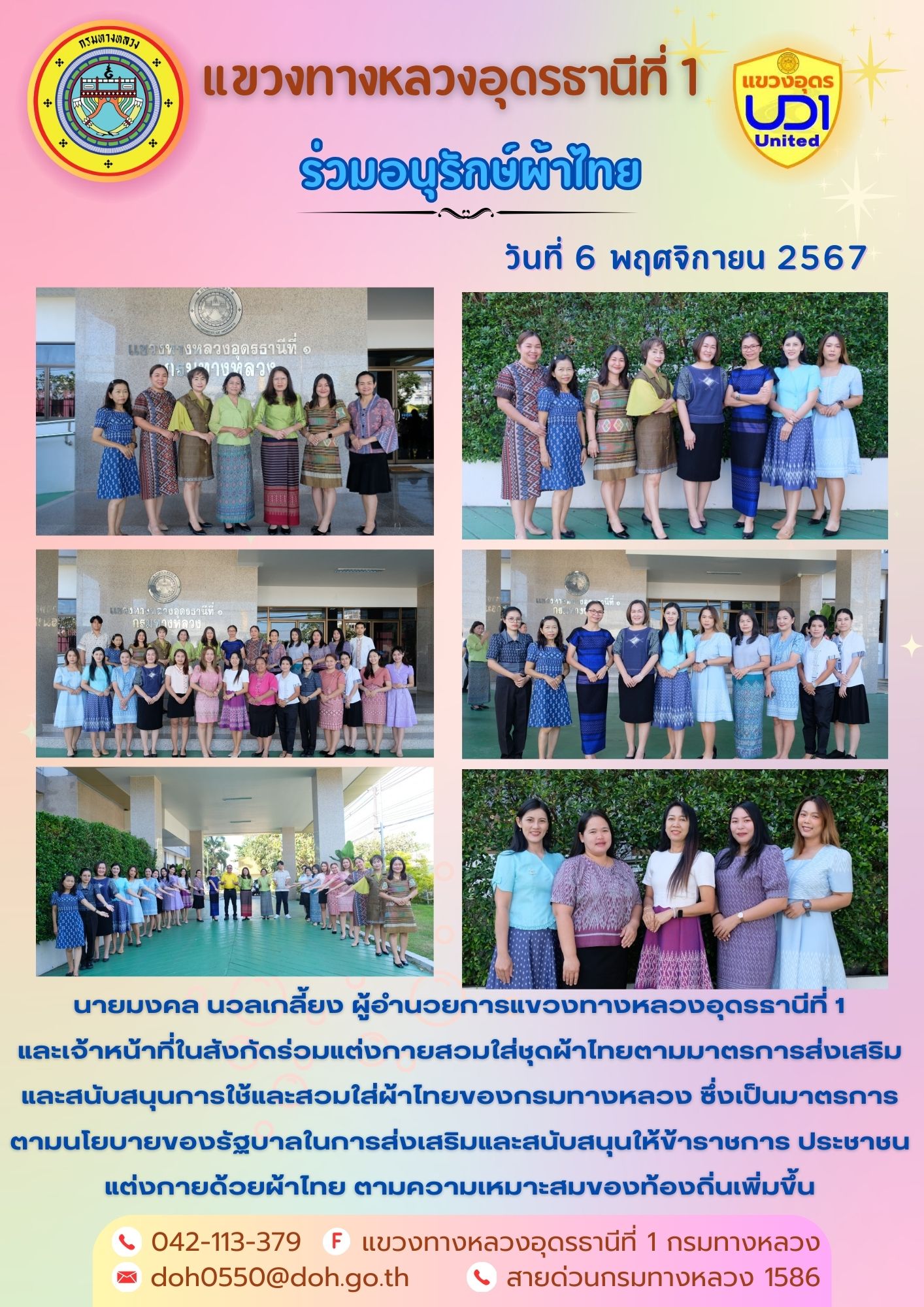 นายมงคล นวลเกลี้ยง ผู้อำนวยการแขวงทางหลวงอุดรธานีที่ 1 ส่งเสริมให้เจ้าหน้าที่ในสังกัดแต่งกายสวมใส่ชุดผ้าไทย ตามมาตรการส่งเสริมและสนับสนุนการใช้ และสวมใส่ผ้าไทยของกรมทางหลวง ซึ่งเป็นมาตรการตามนโยบายของรัฐบาลในการส่งเสริม สนับสนุนให้ข้าราชการ ประชาชน แต่งกายด้วยผ้าไทย ตามความเหมาะสมของท้องถิ่นเพิ่มขึ้น