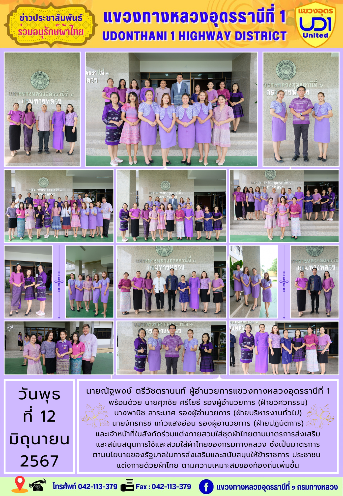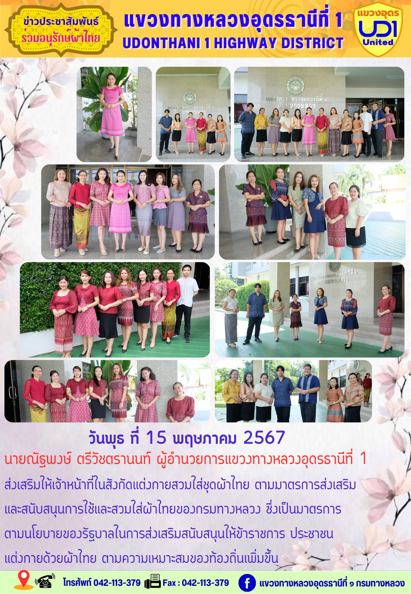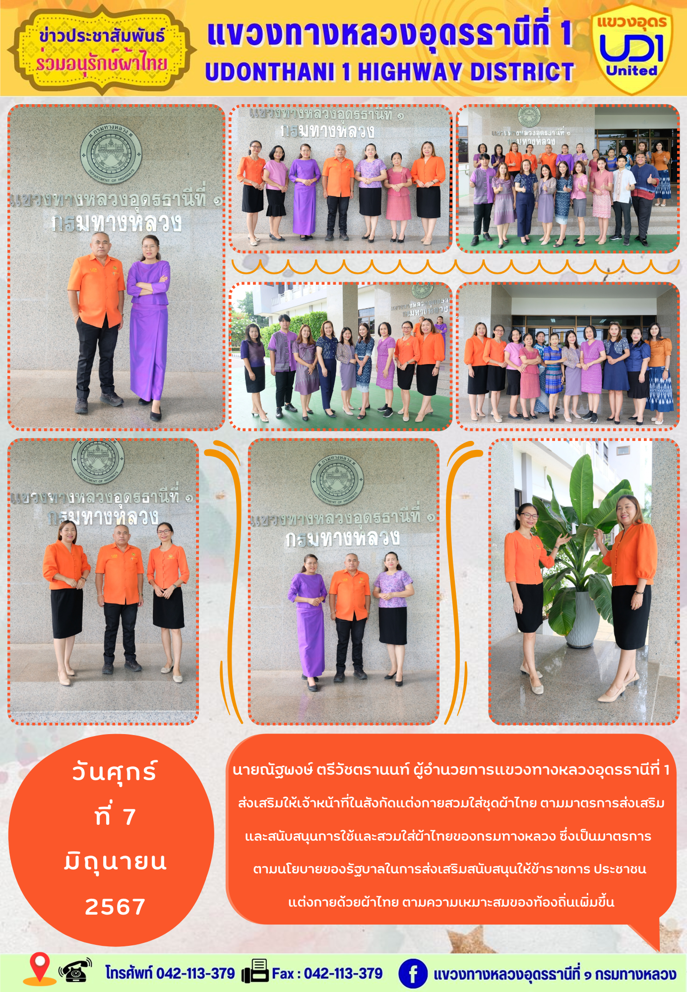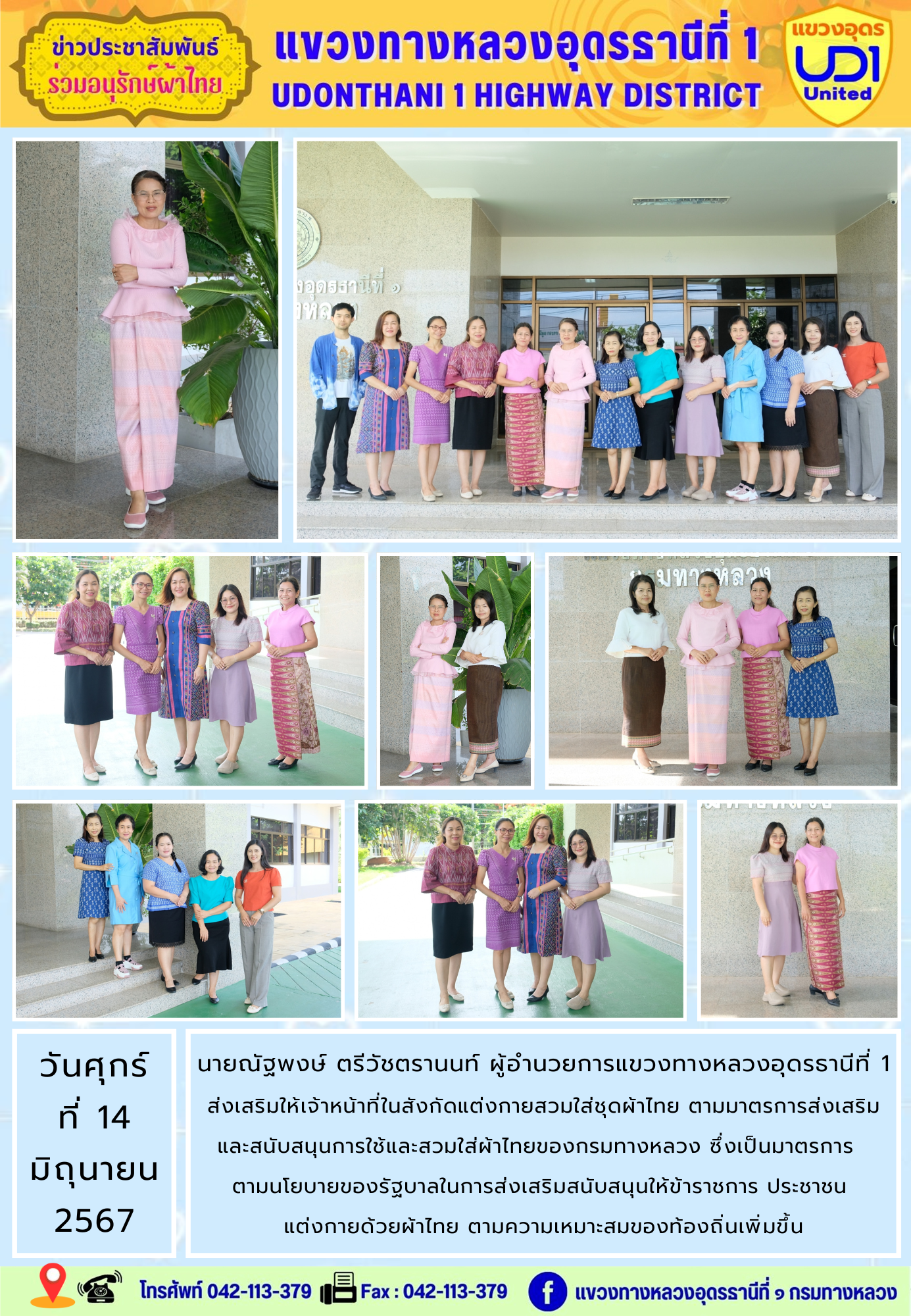 นายณัฐพงษ์ ตรีวัชตรานนท์ ผู้อำนวยการแขวงทางหลวงอุดรธานีที่ 1 พร้อมด้วย นายศุภชัย ศรีโยธี รองผู้อำนวยการ (ฝ่ายวิศวกรรม) นางพานิช สาระมาศ รองผู้อำนวยการ (ฝ่ายบริหารงานทั่วไป) นายจักรกริช แก้วแสงอ่อน รองผู้อำนวยการ (ฝ่ายปฏิบัติการ) และเจ้าหน้าที่ในสังกัดร่วมแต่งกายสวมใส่ชุดผ้าไทยตามมาตรการส่งเสริม และสนับสนุนการใช้และสวมใส่ผ้าไทยของกรมทางหลวง ซึ่งเป็นมาตรการตามนโยบายของรัฐบาลในการส่งเสริมและสนับสนุนให้ข้าราชการ ประชาชน แต่งกายด้วยผ้าไทย ตามความเหมาะสมของท้องถิ่นเพิ่มขึ้น