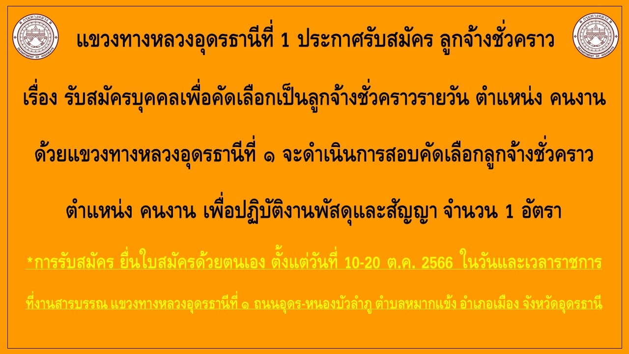 ประกาศแขวงทางหลวงอุดรธานีที่ ๑ รายชื่อผู้ผ่านการสอบคัดเลือกและการขึ้นบัญชีเป็นลูกจ้างชั่วคราวรายวัน ตำแหน่ง คนงาน ปฏิบัติงานพัสดุและสัญญา