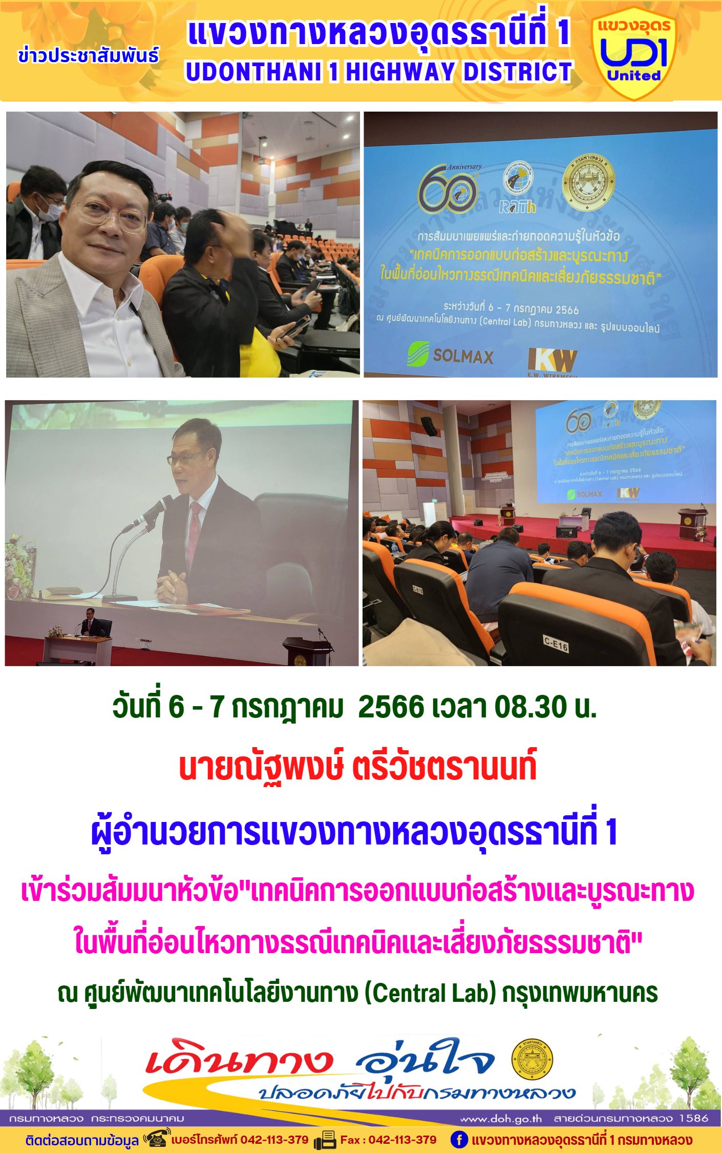 นายณัฐพงษ์ ตรีวัชตรานนท์ ผู้อำนวยการแขวงทางหลวงอุดรธานีที่ 1 เข้าร่วมสัมมนาหัวข้อ"เทคนิคการออกแบบก่อสร้างและบูรณะทาง ในพื้นที่อ่อนไหวทางธรณีเทคนิคและเสี่ยงภัยธรรมชาติ"
