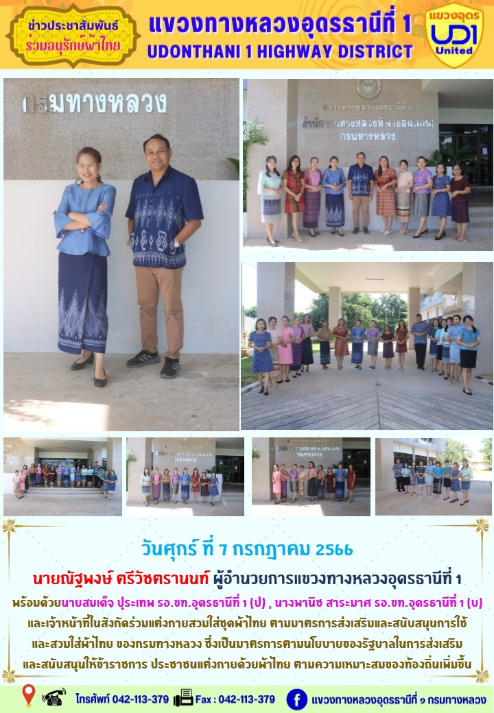 นายณัฐพงษ์ ตรีวัชตรานนท์ ผู้อำนวยการแขวงทางหลวงอุดรธานีที่ 1 พร้อมด้วย นายสมเด็จ ปุระเทพ รอ.ขท.อุดรธานีที่ 1 (ป) ,นายศุภชัย ศรีโยธี รอ.ขท.อุดรธานีที่ 1 (ว), นางพานิช สาระมาศ รอ.ขท.อุดรธานีที่ 1 (บ) และเจ้าหน้าที่ในสังกัดร่วมแต่งกายสวมใส่ชุดผ้าไทยตามมาตรการส่งเสริมและสนับสนุนการใช้และสวมใส่ผ้าไทยของกรมทางหลวง ซึ่งเป็นมาตรการตามนโยบายของรัฐบาลในการส่งเสริมและสนับสนุนให้ข้าราชการ ประชาชน แต่งกายด้วยผ้าไทย ตามความเหมาะสมของท้องถิ่นเพิ่มขึ้น