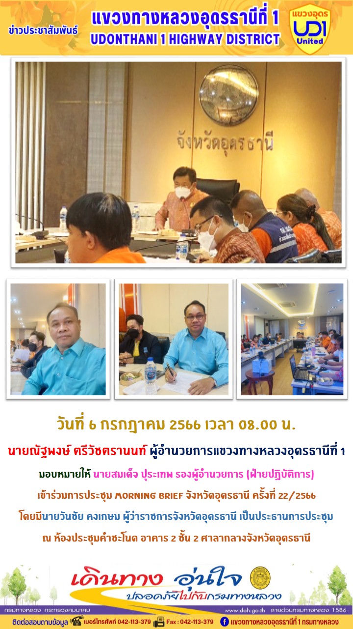 นายณัฐพงษ์ ตรีวัชตรานนท์ ผู้อำนวยการแขวงทางหลวงอุดรธานีที่ 1 มอบหมายให้ นายสมเด็จ ปุระเทพ รองผู้อำนวยการ (ฝ่ายปฏิบัติการ) เข้าร่วมการประชุม Morning Brief จังหวัดอุดรธานี ครั้งที่ 22/2566 โดยมีนายวันชัย คงเกษม ผู้ว่าราชการจังหวัดอุดรธานี เป็นประธานการประชุม ณ ห้องประชุมคำชะโนด อาคาร 2 ชั้น 2 ศาลากลางจังหวัดอุดรธานี