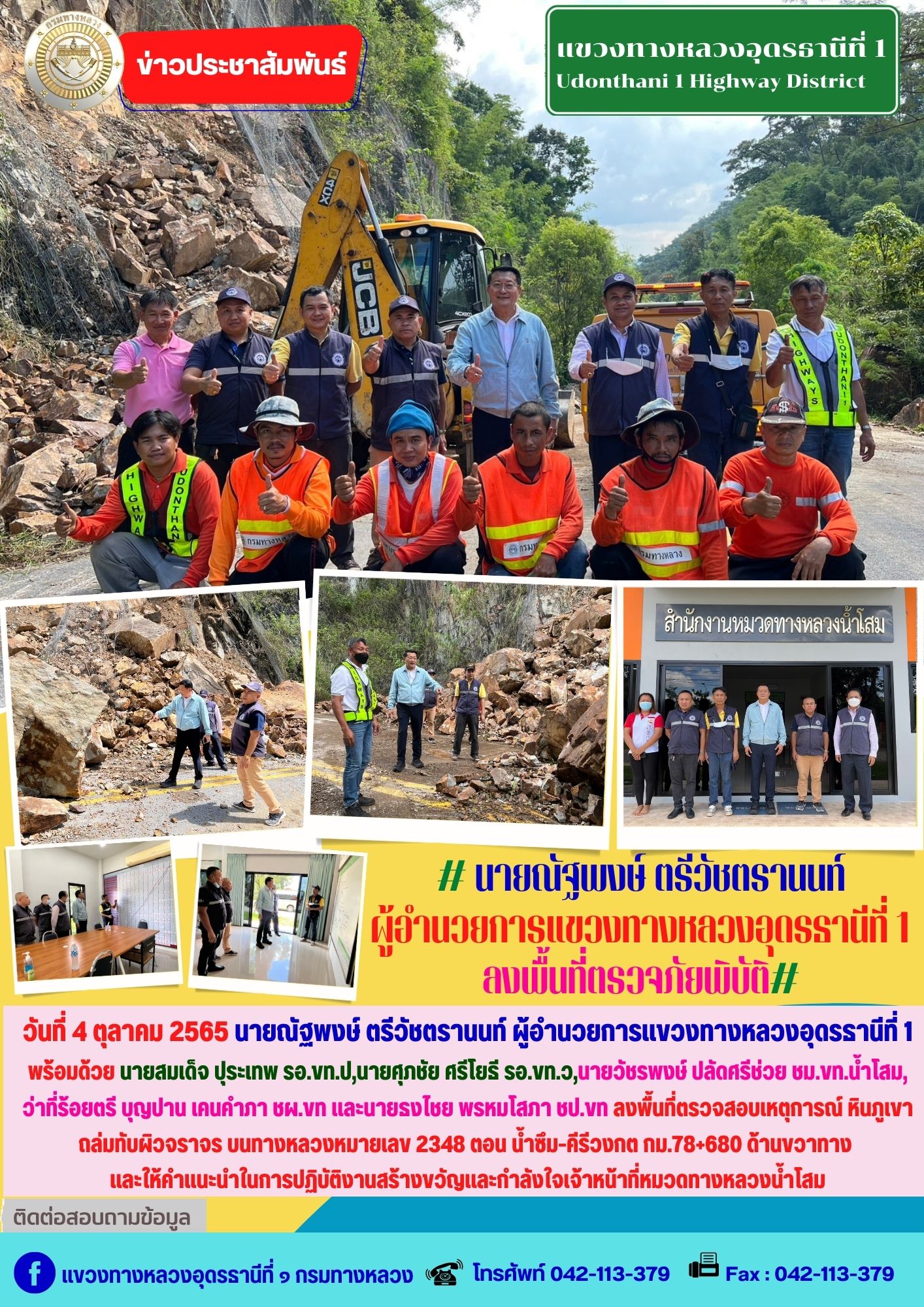 นายณัฐพงษ์ ตรีวัชตรานนท์ ผู้อำนวยการแขวงทางหลวงอุดรธานีที่ 1 ลงพื้นที่ตรวจสอบเหตุการณ์ หินภูเขาถล่มทับผิวจราจร บนทางหลวงหมายเลข 2348 ตอน น้ำซึม-คีรีวงกต กม.78+680 ด้านขวาทาง