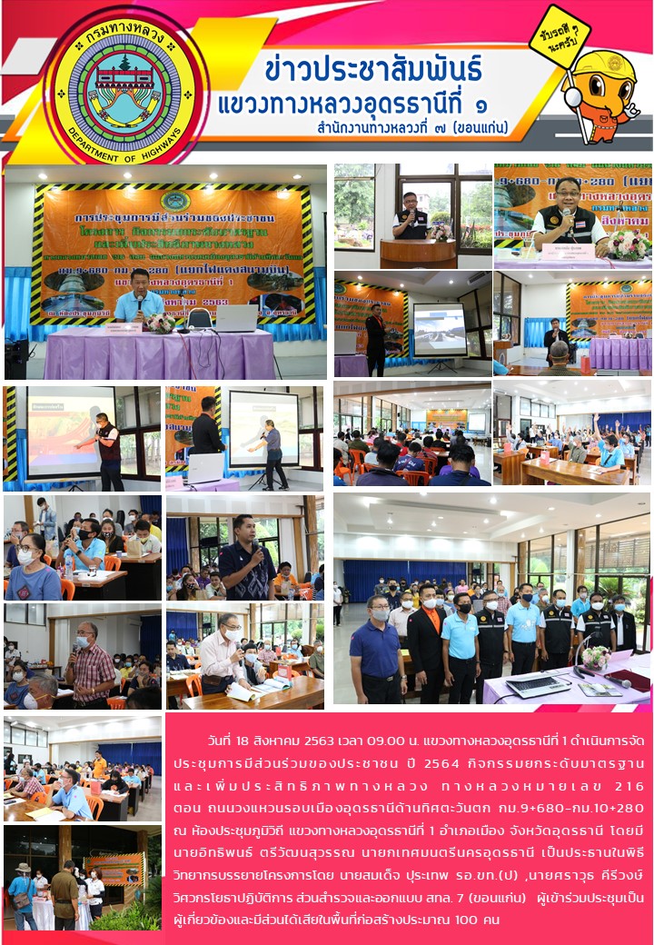 ประชุมการมีส่วนร่วมของประชาชน ปี 2564 กิจกรรมยกระดับมาตรฐานและเพิ่มประสิทธิภาพทางหลวง ทางหลวงหมายเลข 216 ตอน ถนนวงแหวนรอบเมืองอุดรธานีด้านทิศตะวันตก กม.9+680-กม.10+280