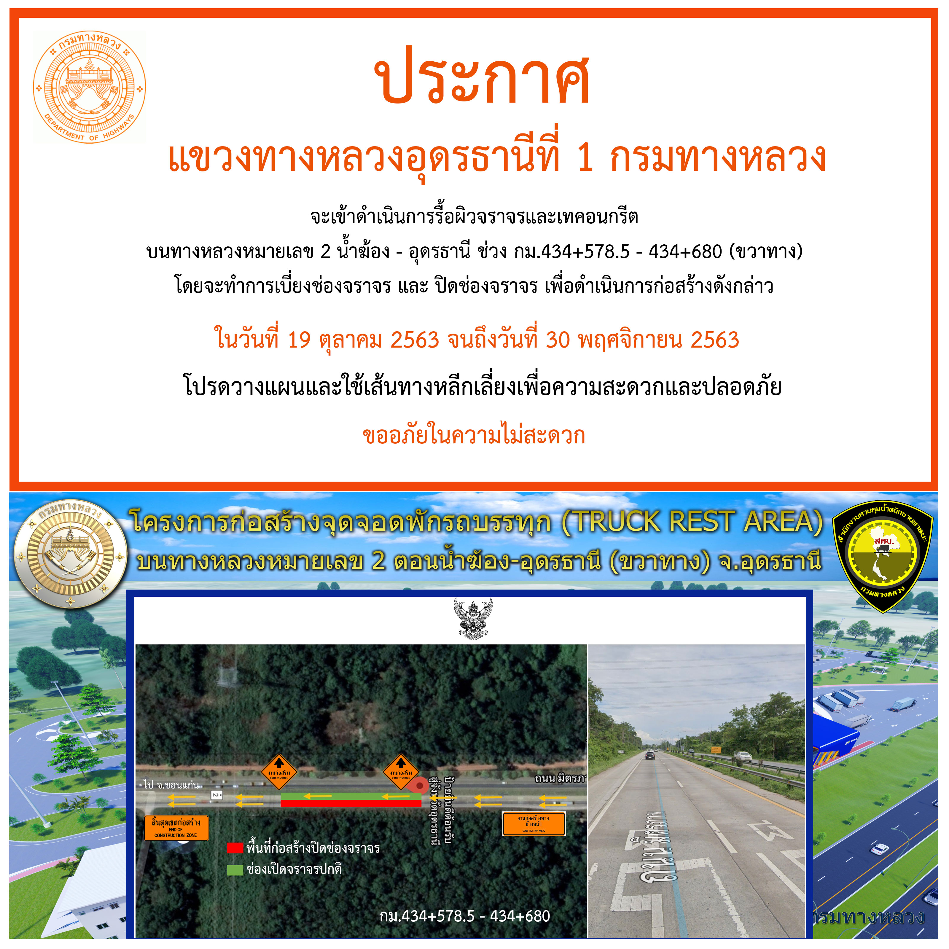 ปิดกั้นพื้นที่จราจรบางส่วน ดำเนินโครงการก่อสร้างจุดจอดพักรถบรรทุก (truck rest area) พร้อมสถานีตรวจสอบน้ำหนักอุดรธานี จ.อุดรธานี ทางหลวงหมายเลข 2 ตอน โนนสะอาด-อุดรธานี