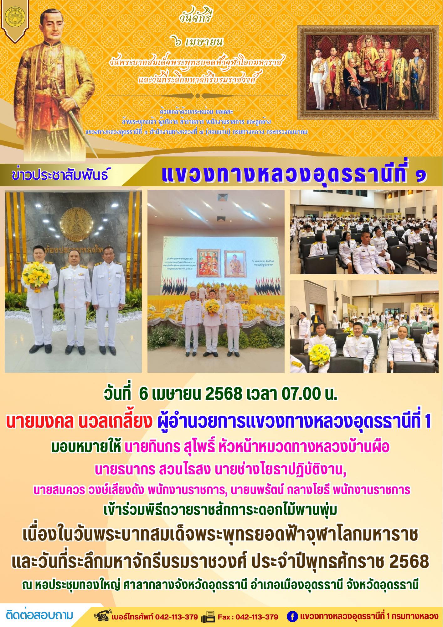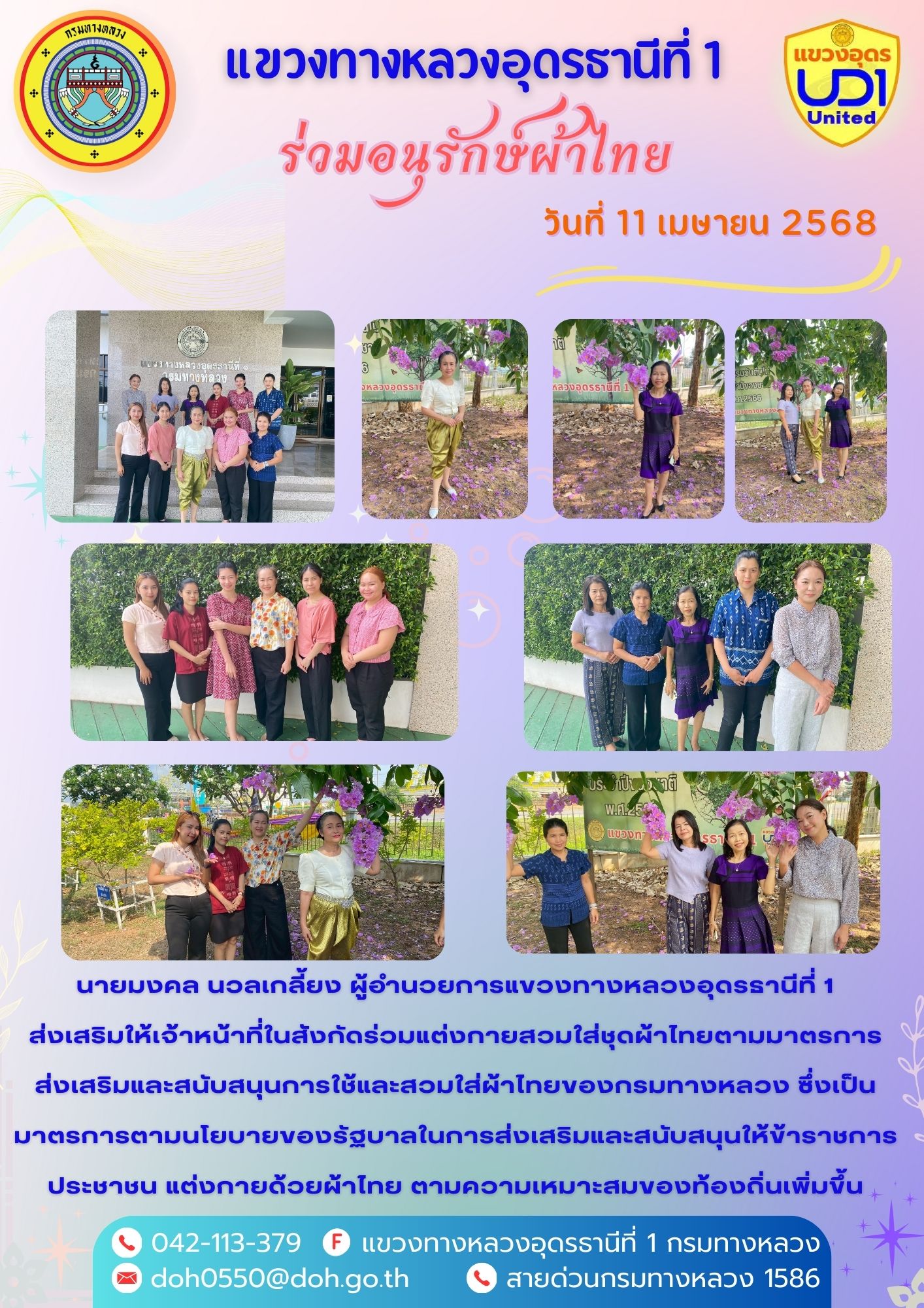 นายมงคล นวลเกลี้ยง ผู้อำนวยการแขวงทางหลวงอุดรธานีที่ 1 ส่งเสริมให้เจ้าหน้าที่ในสังกัดร่วมแต่งกายสวมใส่ชุดผ้าไทยตามมาตรการ ส่งเสริมและสนับสนุนการใช้และสวมใส่ผ้าไทยของกรมทางหลวง ซึ่งเป็นมาตรการตามนโยบายของรัฐบาลในการส่งเสริมและสนับสนุนให้ข้าราชการ ประชาชน แต่งกายด้วยผ้าไทย ตามความเหมาะสมของท้องถิ่นเพิ่มขึ้น