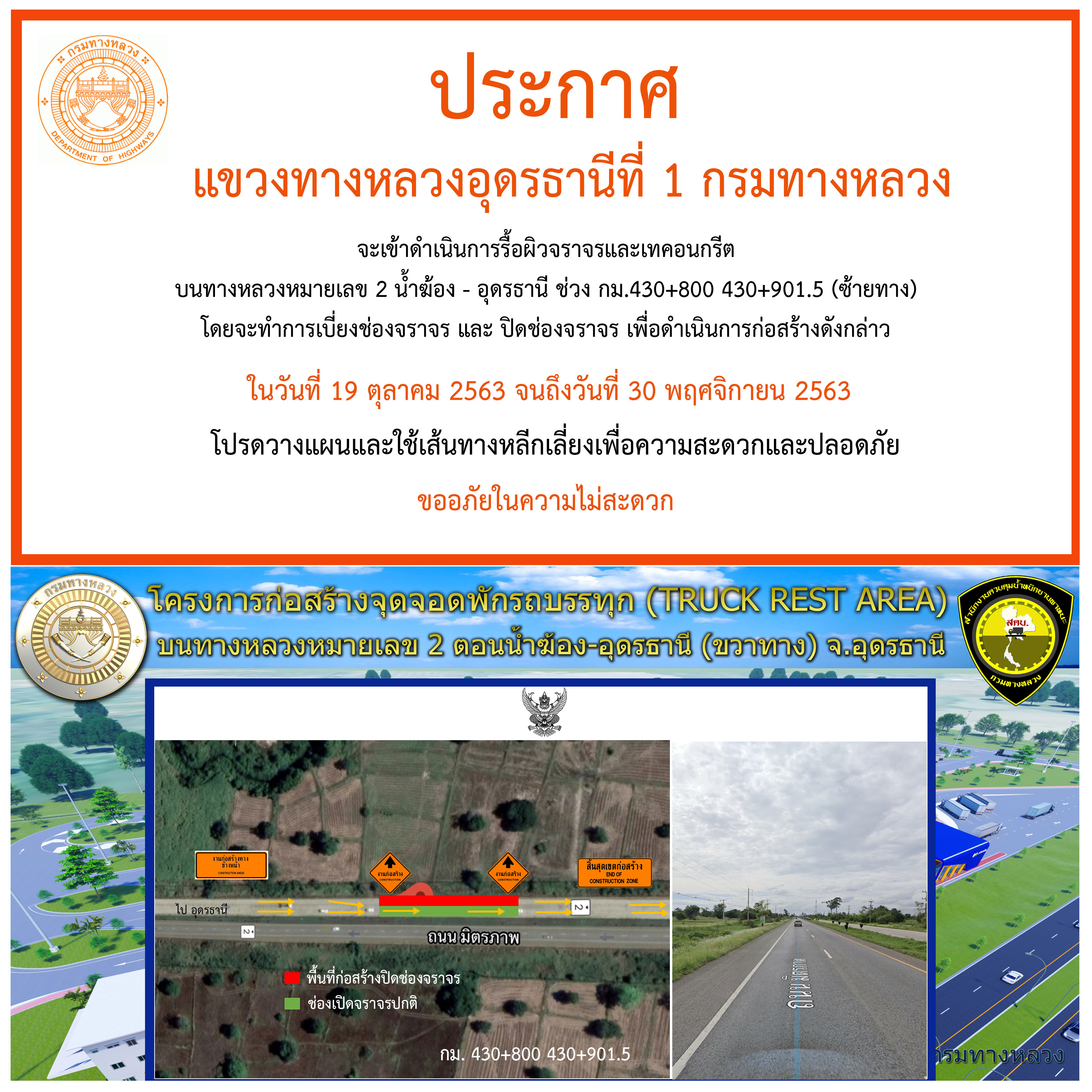 ปิดกั้นพื้นที่จราจรบางส่วน ดำเนินโครงการก่อสร้างจุดจอดพักรถบรรทุก (truck rest area) พร้อมสถานีตรวจสอบน้ำหนักอุดรธานี จ.อุดรธานี ทางหลวงหมายเลข 2 ตอน โนนสะอาด-อุดรธานี