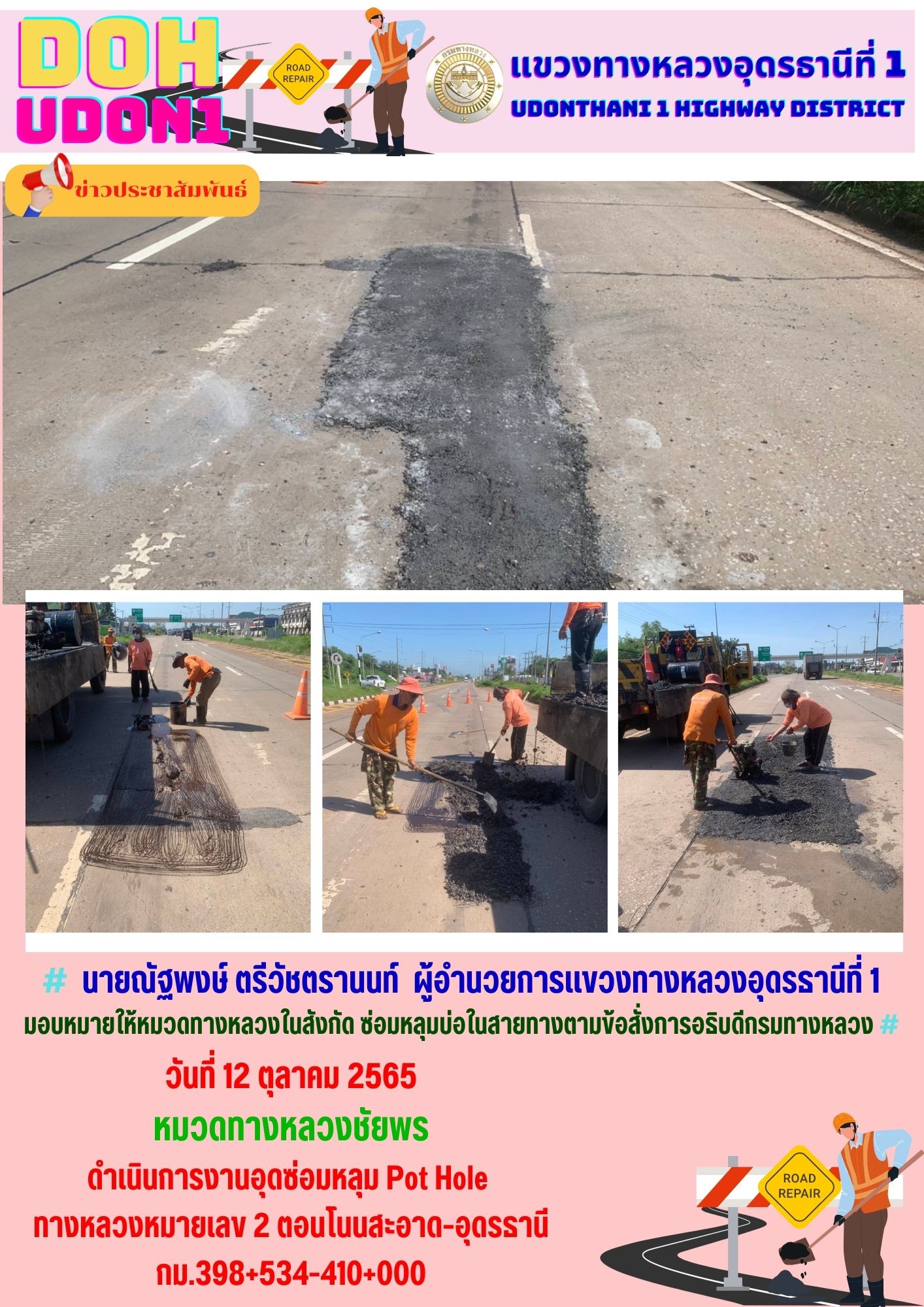 นายณัฐพงษ์ ตรีวัชตรานนท์ ผู้อำนวยการแขวงทางหลวงอุดรธานีที่ 1 มอบหมายให้หมวดทางหลวงในสังกัด ซ่อมหลุมบ่อในสายทางตามข้อสั่งการอธิบดีกรมทางหลวง