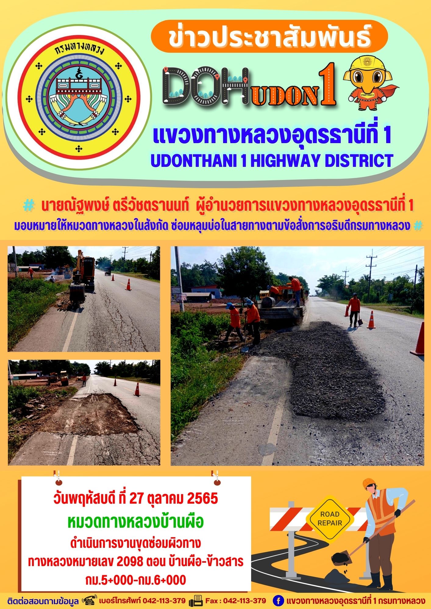 นายณัฐพงษ์ ตรีวัชตรานนท์ ผู้อำนวยการแขวงทางหลวงอุดรธานีที่ 1 มอบหมายให้หมวดทางหลวงในสังกัด ซ่อมหลุมบ่อในสายทางตามข้อสั่งการอธิบดีกรมทางหลวง
