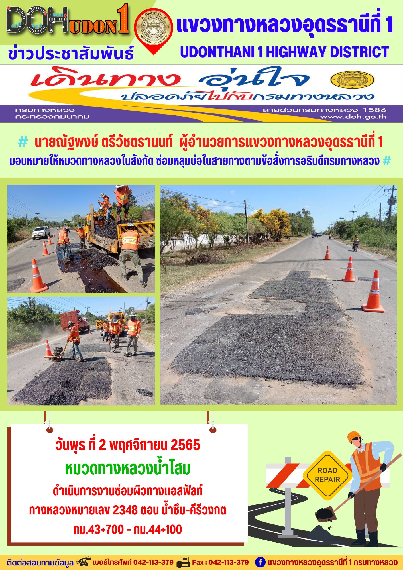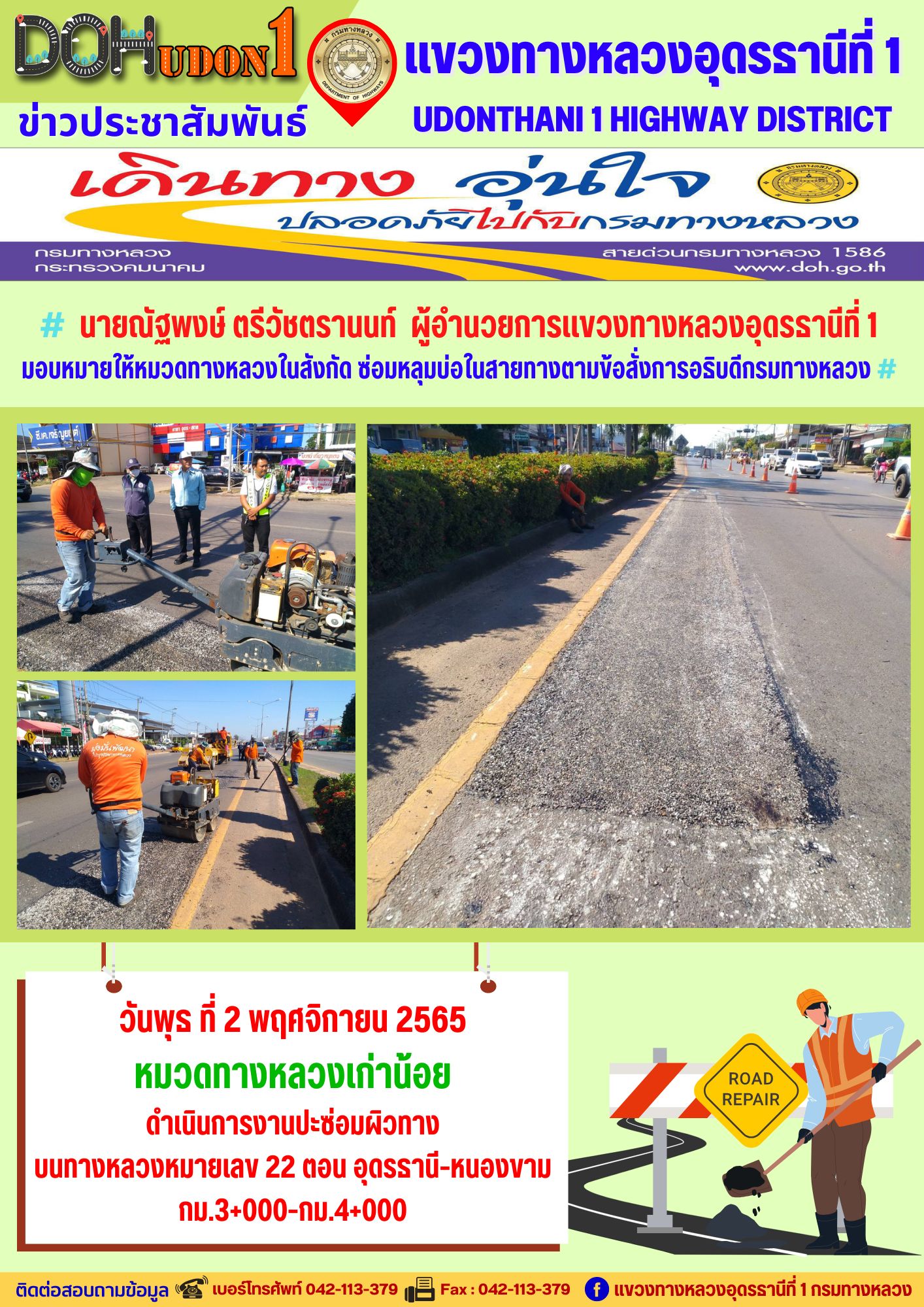 นายณัฐพงษ์ ตรีวัชตรานนท์ ผู้อำนวยการแขวงทางหลวงอุดรธานีที่ 1 มอบหมายให้หมวดทางหลวงในสังกัด ซ่อมหลุมบ่อในสายทางตามข้อสั่งการอธิบดีกรมทางหลวง