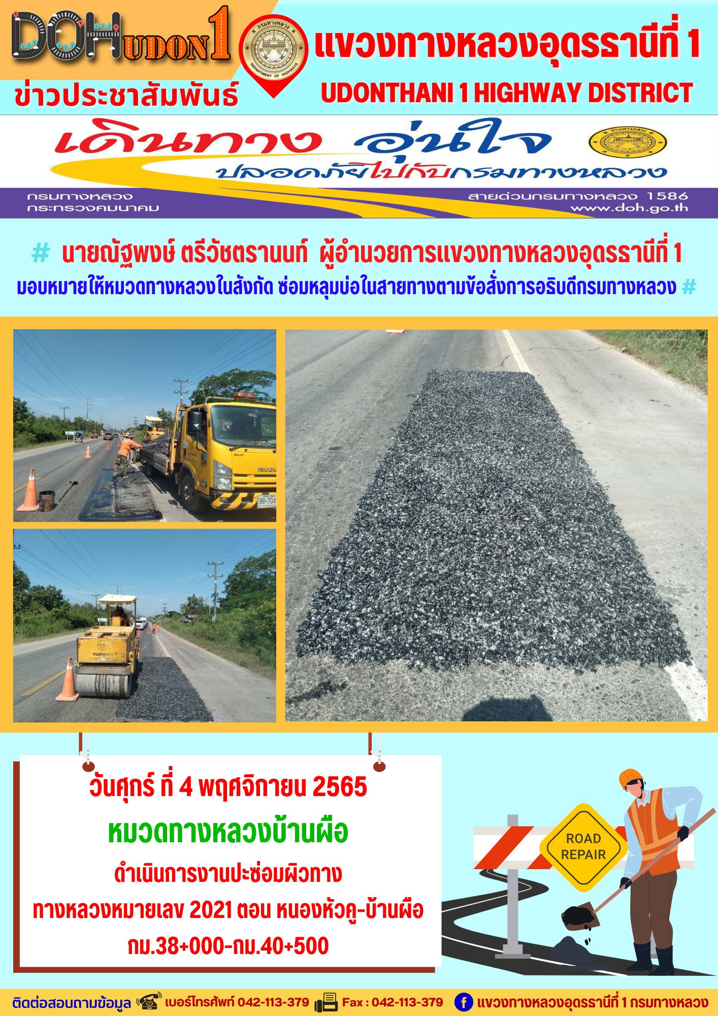 นายณัฐพงษ์ ตรีวัชตรานนท์ ผู้อำนวยการแขวงทางหลวงอุดรธานีที่ 1 มอบหมายให้หมวดทางหลวงในสังกัด ซ่อมหลุมบ่อในสายทางตามข้อสั่งการอธิบดีกรมทางหลวง