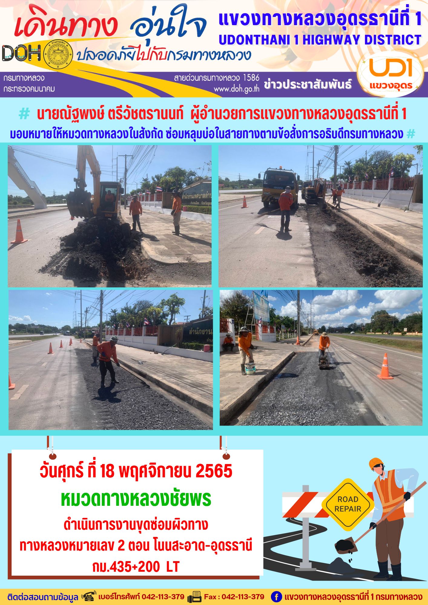 นายณัฐพงษ์ ตรีวัชตรานนท์ ผู้อำนวยการแขวงทางหลวงอุดรธานีที่ 1 มอบหมายให้หมวดทางหลวงในสังกัด ซ่อมหลุมบ่อในสายทางตามข้อสั่งการอธิบดีกรมทางหลวง