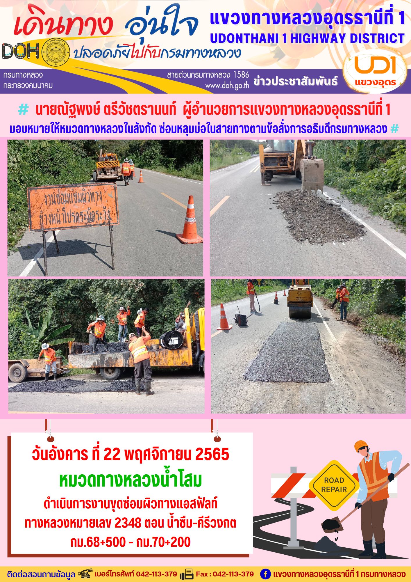 นายณัฐพงษ์ ตรีวัชตรานนท์ ผู้อำนวยการแขวงทางหลวงอุดรธานีที่ 1 มอบหมายให้หมวดทางหลวงในสังกัด ซ่อมหลุมบ่อในสายทางตามข้อสั่งการอธิบดีกรมทางหลวง